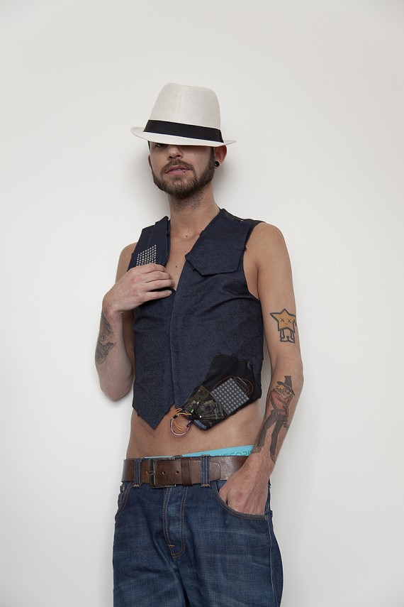 In this first stage, the sending and receiving between clothes is done by hacking a wireless doorbell. This is by far the cheapest solution around. The vest sends a message to the coat: “Hi Love…CU!” which is triggered by a soft button. A timer keeps track of the response and when nothing is heard the chip will start sending a message itself. The more intimate friends can recognize each others by rfid tags. Being close together, the tag will trigger a vibration in a pouch with five vibration motors. Far away friends, or chatting about you on the internet are monitored by a computer. The shirt is in wireless contact with the computer and will play a soundscape of bleeps and small noises when something about you is found on the internet, this could have been a twitter message, blog, email or chat…