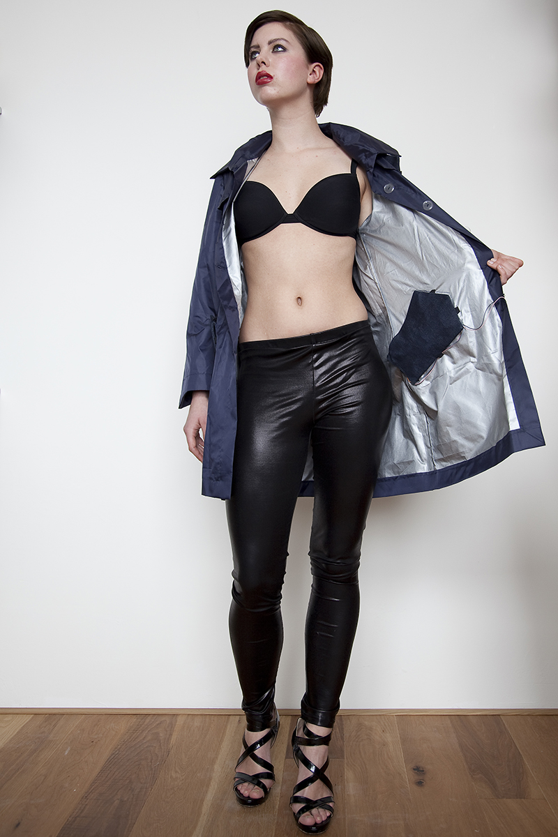 The electronics is hidden in special pockets, which are attached to the clothing with magnets. The shape of the pockets is reflected in the design of the clothing. Before washing, the electronic units can be removed. The wiring is hidden in the lining of the coat and the shirt.