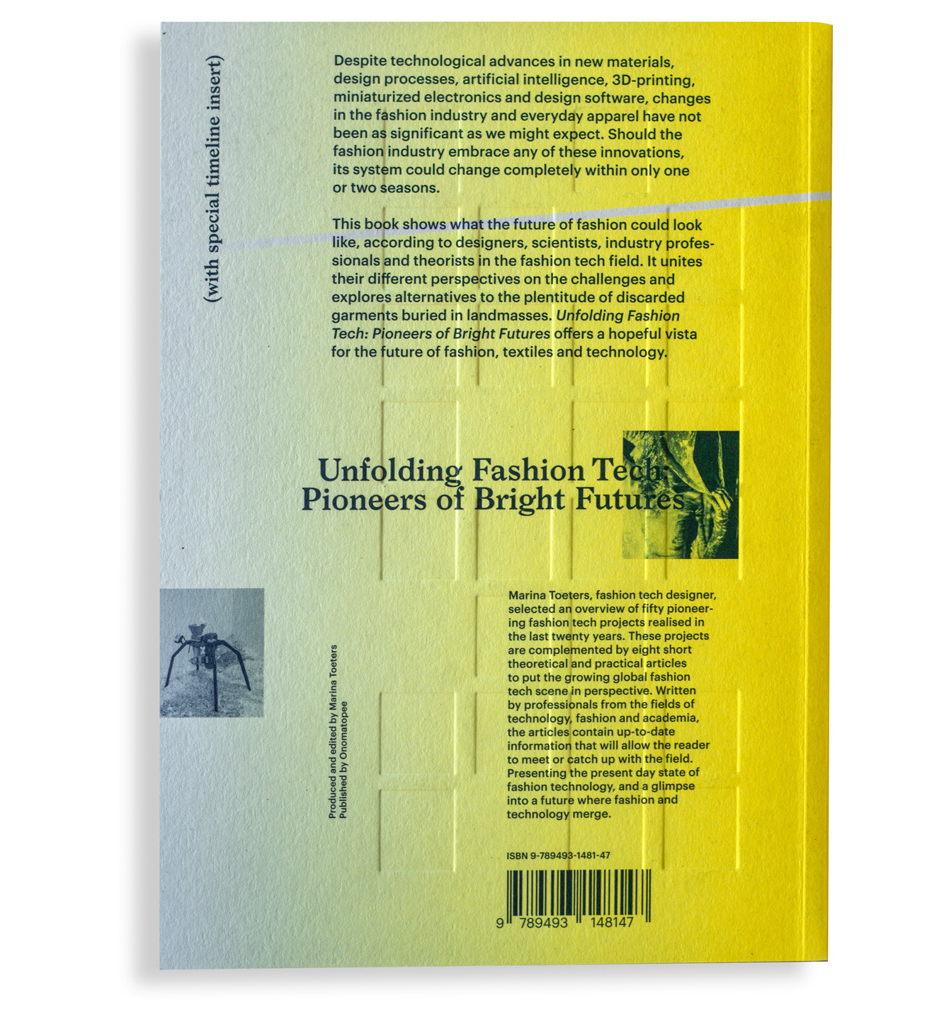 Marina Toeters, fashion tech designer, selected an overview of fifty pioneering fashion tech projects realised in the last twenty years. These projects are complemented by eight short theoretical and practical articles to put the growing global fashion tech scene in perspective. Written by professionals from the fields of technology, fashion and academia, the articles contain up-to-date information that will allow the reader to meet or catch up with the field.