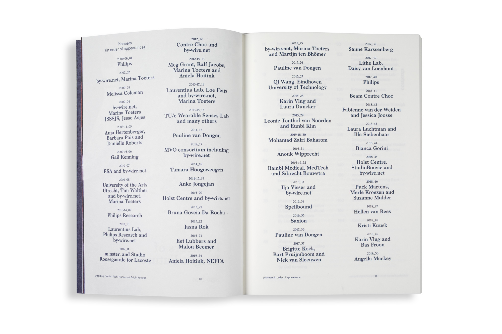 Angella Mackey, Aniela Hoitink, Anja Hertenberger, Anke Jongejan, Anouk Wipprecht, Bambi Medical, Barbara Pais, Bart Pruijmboom, Bas Froon, Beam Contre Choc, Bianca Gorini, Brigitte Kock, Bruna Goveia Da Rocha, by-wire.net, Daisy van Loenhout, Danielle Roberts, Eef Lubbers, Eindhoven University of Technology, Eunbi Kim, European Space Agency (ESA), Fabienne van der Weiden, Gail Kenning, Hellen van Rees, Holst Centre, Ilfa Siebenhaar, Ilja Visser, Jasna Rokegem, Jesse Asjes, Jessica Joosse, Karin Vlug, Kristi Kuusk, LABELEDBY., Laura Duncker, Laura Luchtman, Laurentius Lab, Leonie Tenthof van Noorden, Lithe Lab, Living Colour, Loe Feijs, Malou Beemer, Marina Toeters, Martijn ten Bhömer, M.nster., Melissa Coleman, Mohamad Zairi Baharom, MVO nederland, NEFFA, Niek van Sleeuwen, Pauline van Dongen, Philips, Sibrecht Bouwstra, Solar Fiber (Meg Grant, Ralf Jacobs, Marina Toeters and Aniela Hoitink), StudioBonvie, Studio PMS (Puck Martens, Merle Kroezen and Suzanne Mulder), Qi Wang, Sanne Karssenberg, Saxion, Smart Functional Materials, Spellbound, Studio Roosegaarde, Tamara Hoogeweegen, Tim Walther, TU/e Wearable Senses Lab, University of the Arts Utrecht.