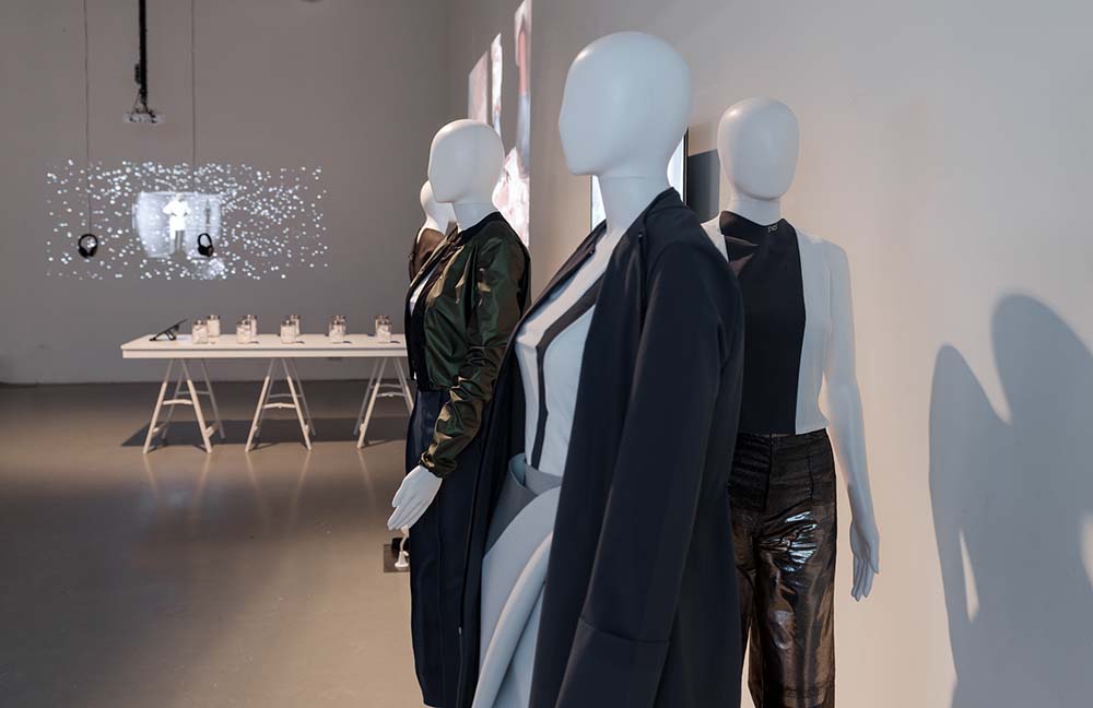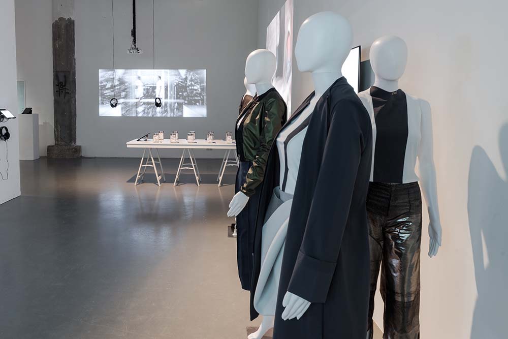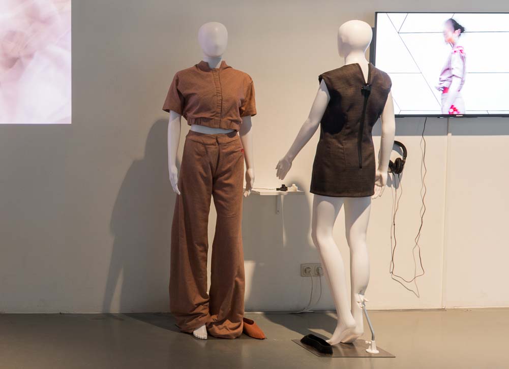 Three outfits are an ecosystem: The interactive collection Depending developed by Marina and Julia van Zilt consists of three pieces that communicate and interact with each other. The skirt provides wireless communication and can disconnect the system by creating another silhouette through magnets. The shirt measures the place where you sweat to detect if it is in response to physical activity or stress. The jacket reacts with a shape change that allows the garment isolate more, or less.