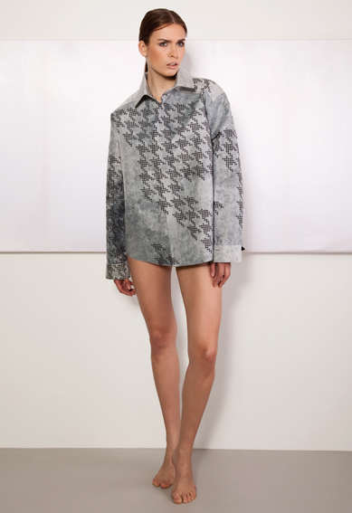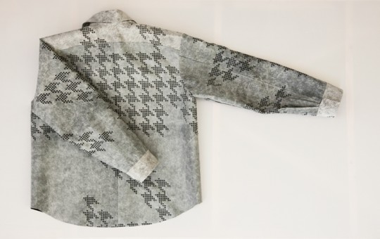 The pattern is generated by a recursive algorithm in Processing, post-processed in Adobe Illustrator and cut with a Speedy300 laser cutter at TU/e. The jack was designed and welded in the fashion technology studio by-wire.net. There exists a classical pied de poule for each N =1,2,3 etc. Taking inspiration from the Cantor set, and using the analysis of the classical pattern, we found a family of elegant new fractal Pied de Poules. At Bridges, the fPDP jacket will be displayed on a mannequin. The outer layer of white fabric has been laser-cut and the tiny holes reveal the black layer underneath.