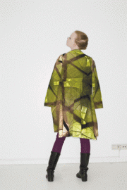 Triangled coat with TNO, HKU and Printed Unlimited [>>] inspired on the 3D body measuring system of TNO. Digital printed on the new full width jet printer at the HKU and fixated by Print Unlimited in Horst, Limburg.
