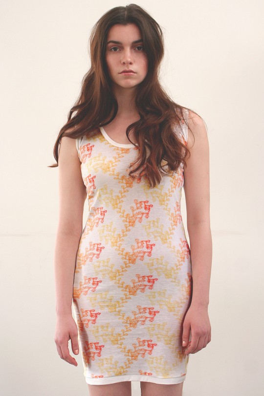 In earlier work Loe and Marina created a new fractal textile pattern which was derived from the well-known houndstooth pattern which originates from weaving with twill binding. See fPDP >> Now we are turning our attention to another basic fabric construction method: warp-knitting. We develop a recursive algorithm and explore the properties of the result and a fashion item based on the new pattern, presented at Bridges 2014 in Seoel, South Korea. Find here more info about the exhibition. Or download the paper ‘Design of a nature-like fractal celebrating warp knitting’.