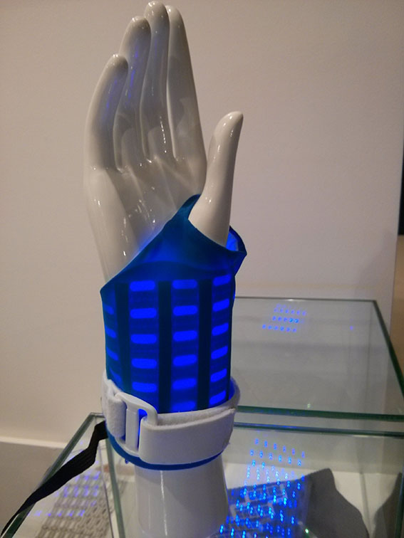 In 2013 we made several Blue light wristband prototypes for Philips. Now on show during TechTextil 2015 in Frankfurt one of the prototypes with the beautiful integration technology of Imec and Holst Centre.